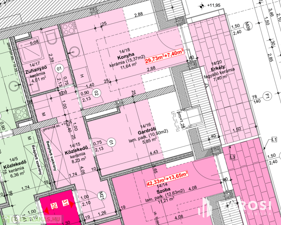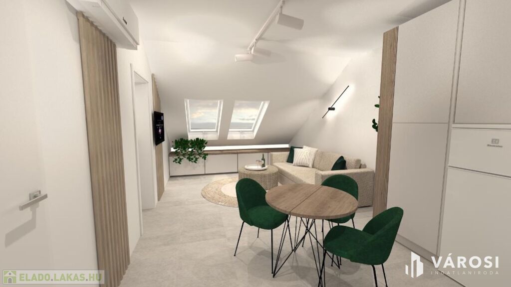 A hirdetésben szereplő lakás 4. emeleti, tetőtéri, 29,73 m2 alapterületű, 7,4 m2 erkéllyel és udvari kilátással rendelkezik.
