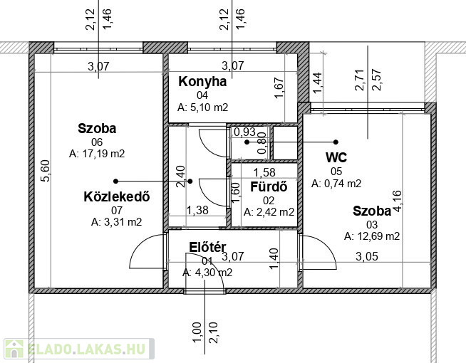 Az ingatlan a kedvelt elrendezésben található. Két külön bejáratú szoba. Közlekedő, fürdő wc-vel és konyha.