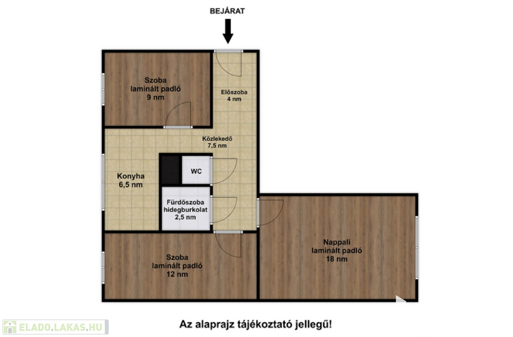 - laminált padló a szobákban, hidegburkolat a többi helyiségben,
