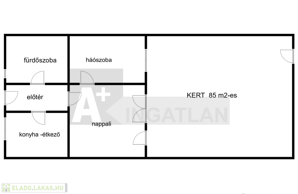 A lakás elrendezését tekintve : közös , zárt , átriumos udvarból nyílik , előszoba , jobbra megfelelő méretű , étkező -konyha , balra , tágas fürdőszoba -wc-vel , majd a napfényes csupa ablak nappali és igazi kuriózum 85 m2-es kertkapcsolat és nappaliból nyílik a hálószoba is.