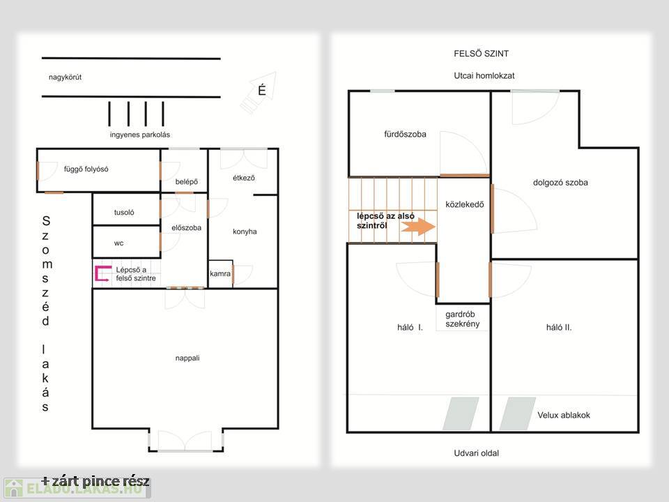 Szeged-Belváros, Brüsszeli körútnál 90 m2-es, nappali + 3 szobás, étkező konyhás, 2. fürdőszobás, belső két szintes, napfényes, alacsony rezsiköltségű, cirkó fűtésű, felújítandó állapotú, 2. emeleti téglalakás, zárt, udvari parkolóval, 1990-ben épült társasházban, tehermentesen eladó. A ház előtt 5 db ingyenes parkolóhely kialakított, a lakáshoz 6 m2-es saját tároló tartozik az alagsorban. Megerősítették a villanyhálózatot (32 A), új kazán, új villanytűzhely került behelyezésre 5 éve. Az ingatlan hangulatos és jó elosztású: az alsó szinten előtér, tusoló, külön WC, közlekedő, étkező-konyha-spájz, és tágas nappali, az emeleten kádas fürdőszoba WC-vel, gardróbszekrény és 3 külön bejáratú szoba (kettőben beépített bútorzatokkal is) található. Az e fölötti tetőteret még be lehet építeni – így a lakás bővíthető akár 3 szobával is. A burkolatok parketta és laminált padló, kivétel az egyik emeleti hálószoba (szőnyegpadlós) a többi helyiség járólapos. Az ablakokon árnyékolók és szúnyoghálók vannak. Közelben a Széchenyi tér és a Tisza, a szomszédságban üzletek és tömegközlekedési megállók (buszok, troli, villamos).