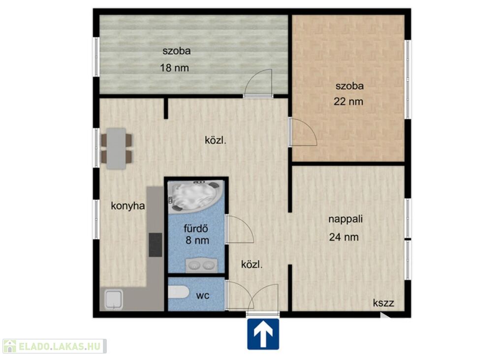 - Nappali + 2 szoba, konyha fürdő, WC, közlekedő.