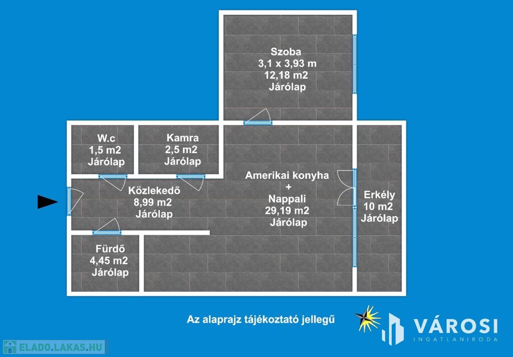 A lakás 1 db amerikai konyhás nappalival, 1 db hálószobával, 1 db fürdőszobával, külön Wc-vel, közlekedővel, erkéllyel rendelkezik.