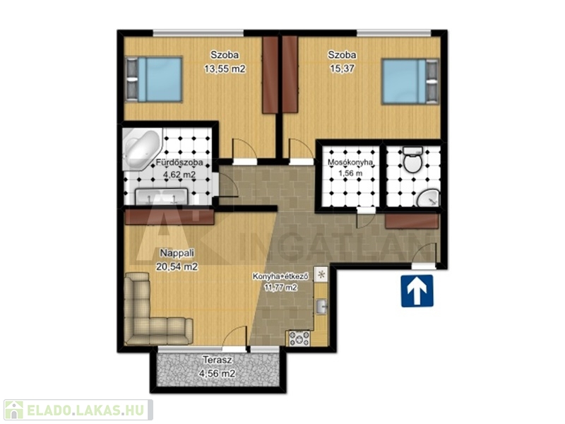 Amerikai konyhás nappali + 2 szoba , Erkély: 4,56 m2