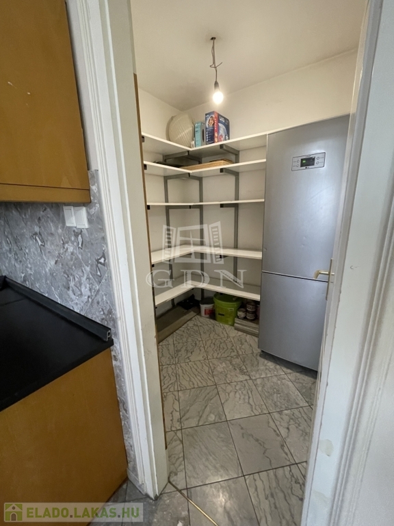 A lakásban nagyon sok tárolási lehetőség van, hiszen egy nagy méretű spájz, gardrob helyiség és több beépített szekrény is található.