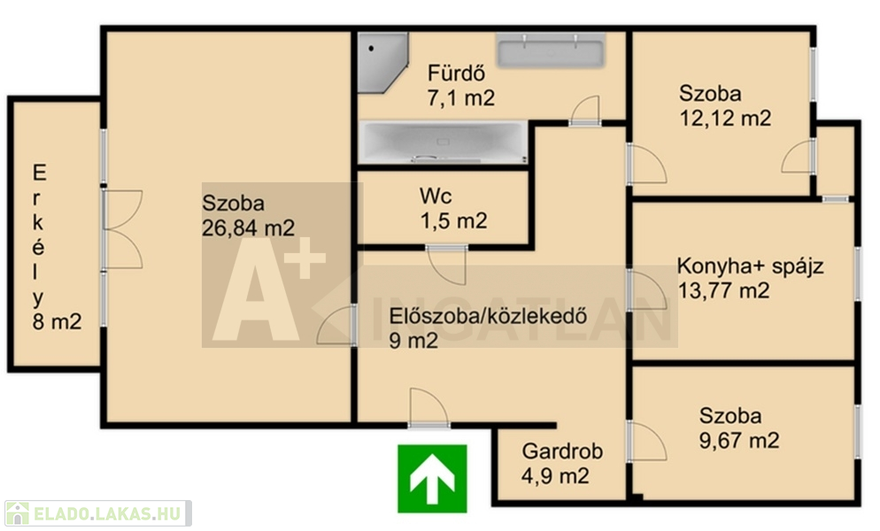 Jelenleg nappali + 2 szobás, de könnyen kialakítható belőle nappali+ 3 szoba.
