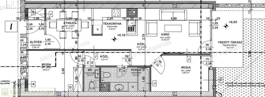 A szóban forgó földszinti lakás az alaprajzon irodaként szerepel, a helyiségek is ennek megfelelően vannak elnevezve. 62 m2 területű, ha lakásként funkcionál akkor amerikai konyha nappali +2 hálószobás , fürdőszoba- WC-vel , WC külön helyiségben is , 8 m2 fedett terasz és 25 m2 kert rész tartozik hozzá. (a fotók között található alaprajz szerint). Ennek a lakásnak a megvásárlásához a 3%-os otthon start hitel és a CSOK + hitel nem vehető igénybe.