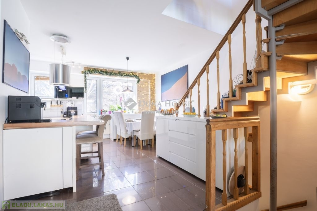 Az ingatlan lakótere az első emeleten kezdődik, ahova, a kerti szintről néhány lépcső vezet fel, egy zárt saját lépcsőházból. A lakás alsó szintje egy légterű, nyitott, ezáltal világos, jól átlátható és szellőztethető. A nappalit és az étkező-konyhát egy közlekedő választja el egymástól, ahova a WC és a kazánház/tároló nyílik, a konyhából pedig egy kis kamrát is leválasztottak. A nappali előtt egy DK- tájolása, nagyméretű nyitott terasz húzódik, mely tavasztól őszig a lakás szerves része, családi-baráti összejövetelek kellemes helyszíne.
