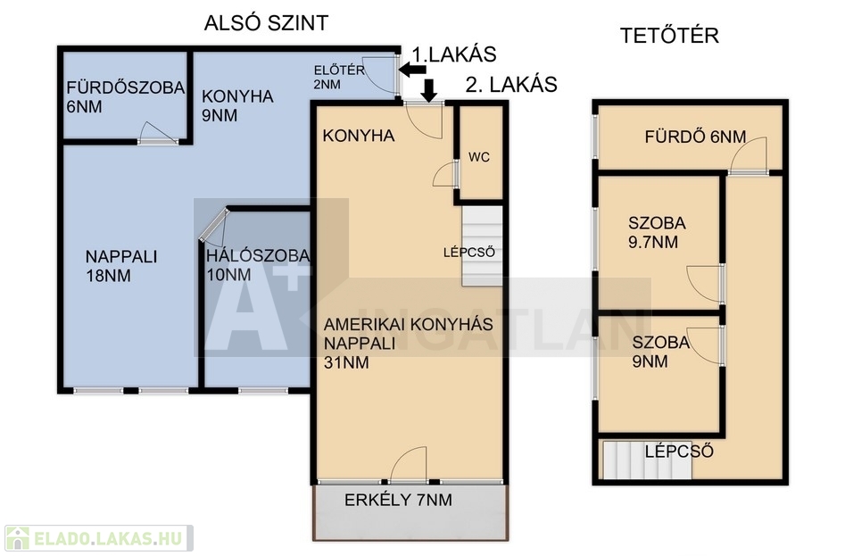 - belső kétszintes, alsó szint 33nm+7nm erkély, felső szint nettó 25nm