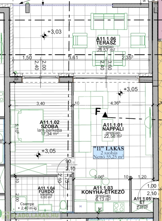 Elrendezés: konyha + étkező – nappali, szoba, előtér, fürdő/wc egy helyiségben, terasz: 28,57nm