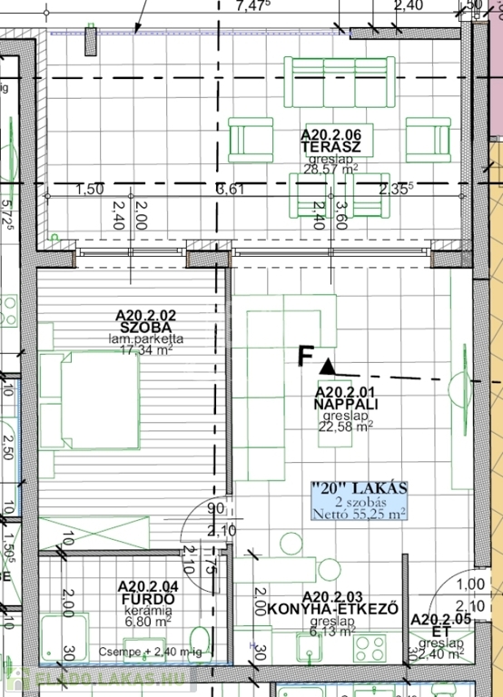 Elrendezés: konyha + étkező – nappali, szoba, előtér, fürdő/wc egy helyiségben, terasz: 28,57nm