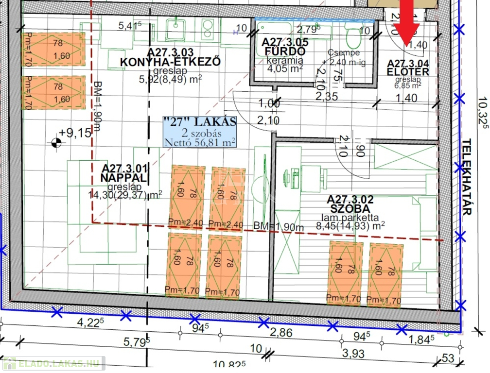 A27 lakás: 74,45 m2|konyha + étkező - nappali, 2 hálószoba, előtér, fürdő + wc, különálló wc