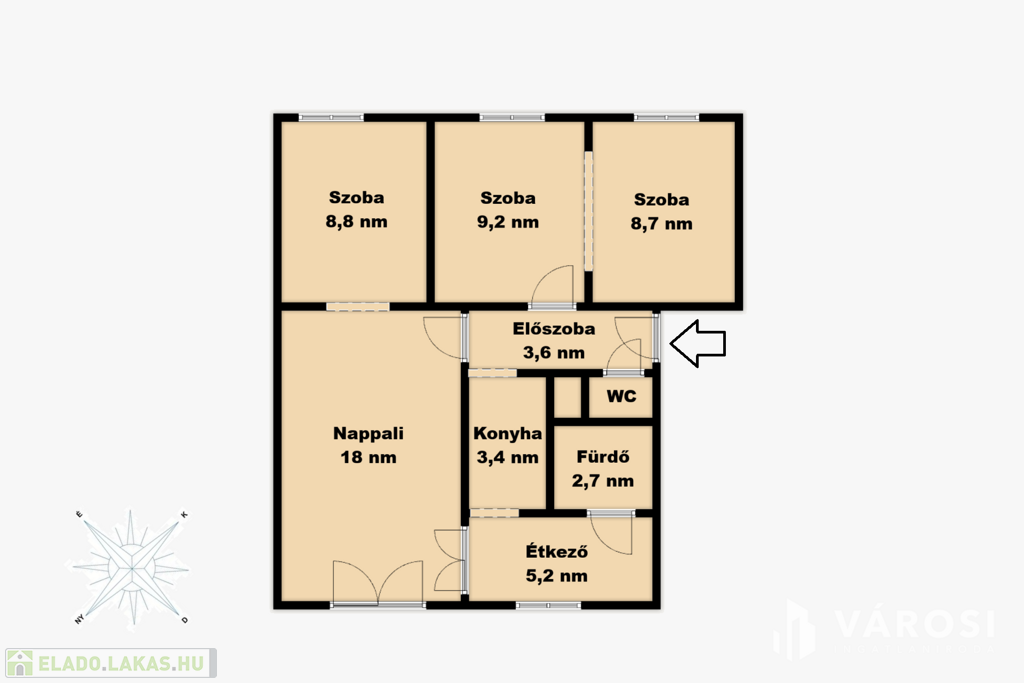 Az előszobából nyílik a wc-n kívül a konyha, egyik dupla szoba és a nappali. A nappaliból pedig egy további szoba és az étkező.