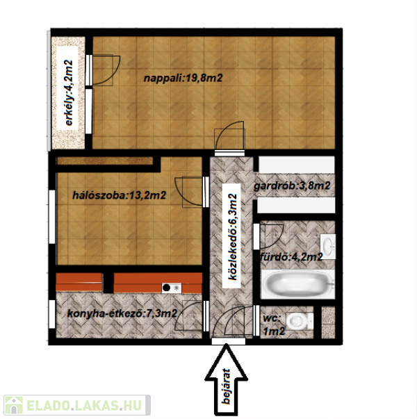 A lakás elrendezése: nappali + 1 hálószoba, konyha, fürdőszoba, külön mellékhelyiség, méretes gardrób, közlekedő és egy tágas erkély.