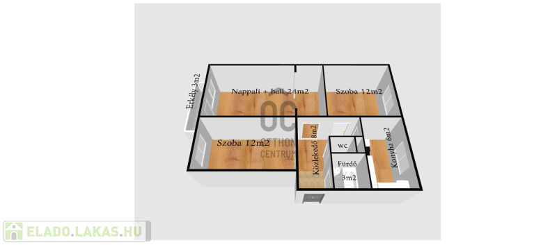 A három szobán kívül, a 68 m2-en a lakás magában foglal egy előszoba-közlekedőt, egy nagy konyha-étkezőt, egy nappalihoz csatlakozó hallt, egy fürdőszobát, egy mellékhelyiséget és egy napos erkélyt.