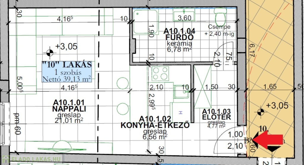 A10 lakás: 39,13 m2|konyha + étkező - nappali, előtér, fürdő + wc,