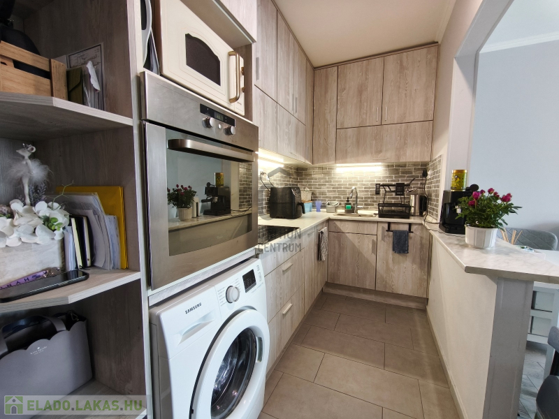 Székesfehérváron, a Belvárosban található ez a praktikusan átalakított lakás, amely eredetileg a klasszikus 2 szoba hallos volt. A tulajdonos a konyhát a hall részbe költöztette, így a nappalival egy légtérbe került. A konyha helyén egy félszoba lett kialakítva.