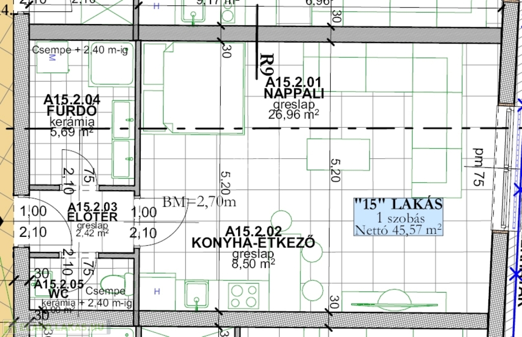 Elrendezés: konyha + étkező – nappali, előtér, fürdő/wc külön helyiségben