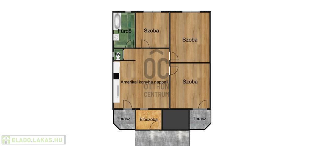 A három szobán kívül, a 100m2-en a lakás magában foglal egy hatalmas amerikaikonyha-nappalit, egy tágas előszobát, egy fürdőszobát, egy mellékhelyiséget és kettő erkélyt.