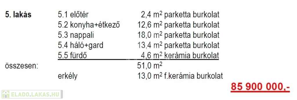 A lakás alaprajza és a helységek listája a képek között megtalálható.