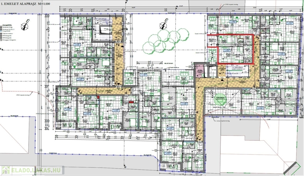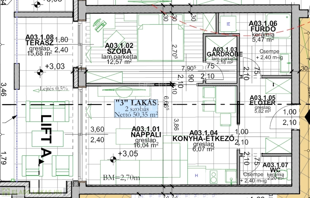 Elrendezés: konyha + étkező - nappali, hálószoba, előtér, gardrób, fürdő, wc külön helyiségben, terasz 15,68nm