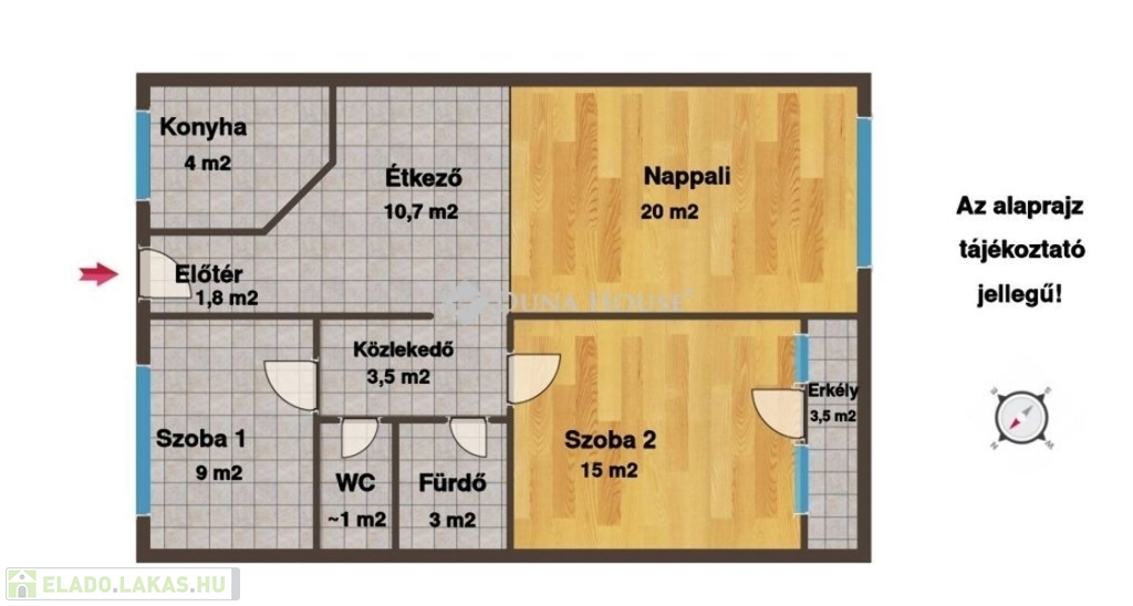 68 négyzetméteren kapott helyet 2 hálószoba, nappali, étkező, konyha, külön fürdőszoba és wc. Az elrendezés a mai kor követelményeinek megfelel, a lakótér és a vendégek fogadására kiválóan alkalmas nappali/étkező elkülönül egymástól.