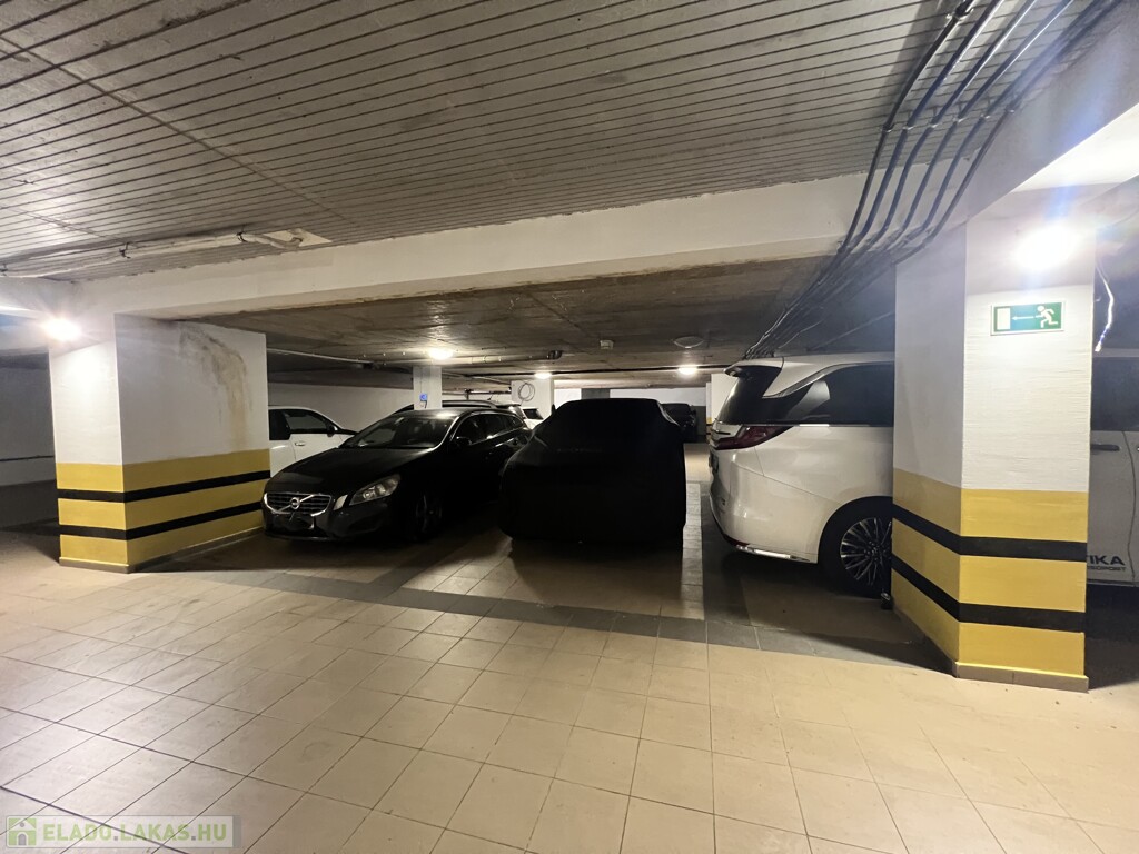 A társasház teremgarázsában saját kocsibeálló külön 11 millió Ft-ért megvásárolható.