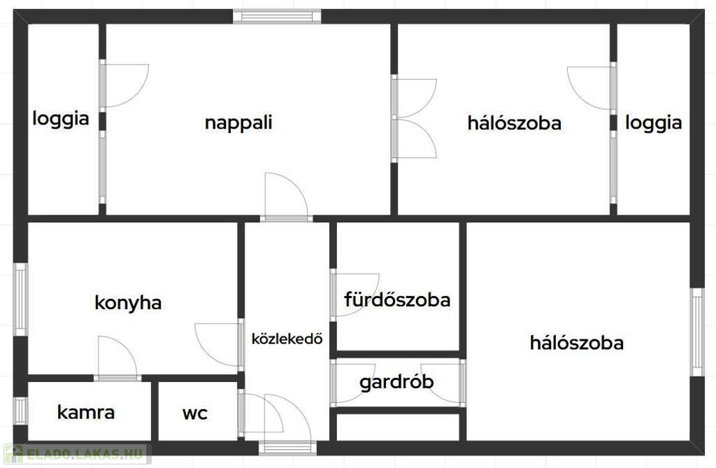 - a 89 nm-es, 3 egész szobásként nyilvántartott lakás helyiségei: közlekedő, nappali - udvar felé néző loggiával; nappaliból nyíló hálószoba loggiával; egy teljesen külön nyíló szoba, mely egy beépített szekrényekkel ellátott "gardrób- jellegű" közlekedőről közelíthető meg; konyha; kamra; kádas fürdőszoba illemhellyel és egy külön helyiségben található "plusz illemhely"