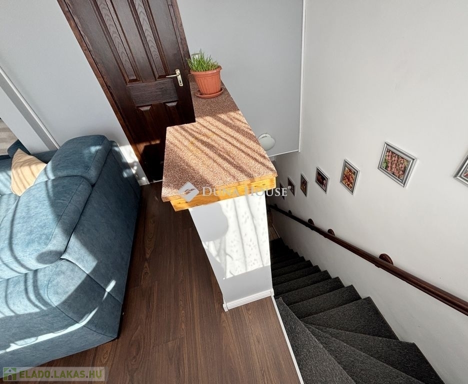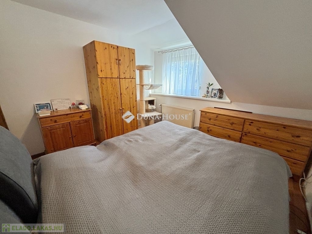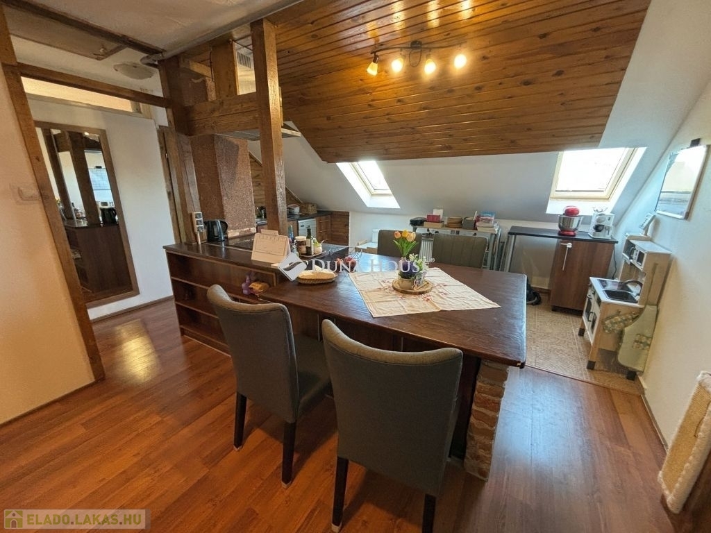 Szombathely kámoni városrészén jó állapotú, nettó 90 m2 alapterületű lakás eladó. Az ingatlan egy kétlakásos társasház utcafronti oldalára nyílik, ahol egy kis udvarrész is tartozik hozzá. A térkövezett udvaron parkolni is lehet egy autóval, további egy gépkocsival a kapu előtti hídon. A lakás nagyobb része két szintre osztott, az emeleten egy tágas világos nappali fedett terasszal és egy mellékhelyiség van kialakítva, a tetőtérben kapott helyet a két hálószoba, a konyha étkezővel, egy fürdő és egy kis háztartási helyiség wc-el. A földszinti bejárati részen van még egy kis tároló és az előszoba. Az ingatlan rendezett karbantartott állapotú, az elmúlt években megújult többek között a nappali, és a nyílászárók is korszerűsítve lettek, az ablakok redőnnyel és rovarhálóval is fel vannak szerelve. A tetőtéri ablakokat tavaly cserélték korszerűbbre.