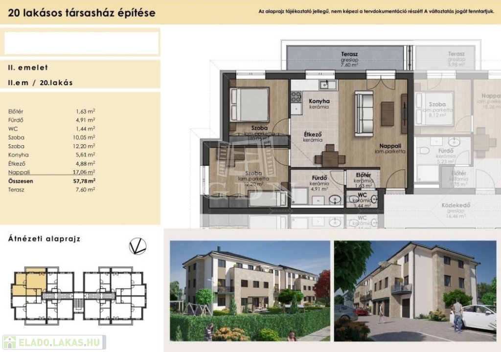 A három szintes kettő emeletes, 20 lakásos modern társasházak minden igényt kielégítő, magas műszaki tartalommal valósulnak meg. A kiváló tájolású 40-67 m2 közötti ingatlanokat nagyon jó elosztás és élhető terek jellemzik. A lakások nappali+egy , nappali +kettő szobásak lesznek. A földszinti lakások komfortérzetét teraszok, saját kertek az emeleti lakásokét jó méretű erkélyek fokozzák. Nyílászárói 3 rétegű fokozottan hő- és hangszigetelt üvegezésű műanyag ablakok és erkélyajtók, redőny fogadására alkalmas szemöldök kialakítással. A lakások bejárati ajtaja MABISZ minősítéssel rendelkező tömör, több ponton záródó biztonsági ajtó. Fűtése központi gázfűtés tervezett, kondenzációs gázkazánnal a lakásokban egyedi hőmennyiség szabályozással és mérővel, padlófűtéses hőleadással. Klímaelőkészítést a vételár magában foglalja. Hideg -meleg burkolatok ,szaniterek, csaptelepek, beltéri ajtók választhatók. Az ingatlanhoz felszíni parkoló, garázs vásárolható.