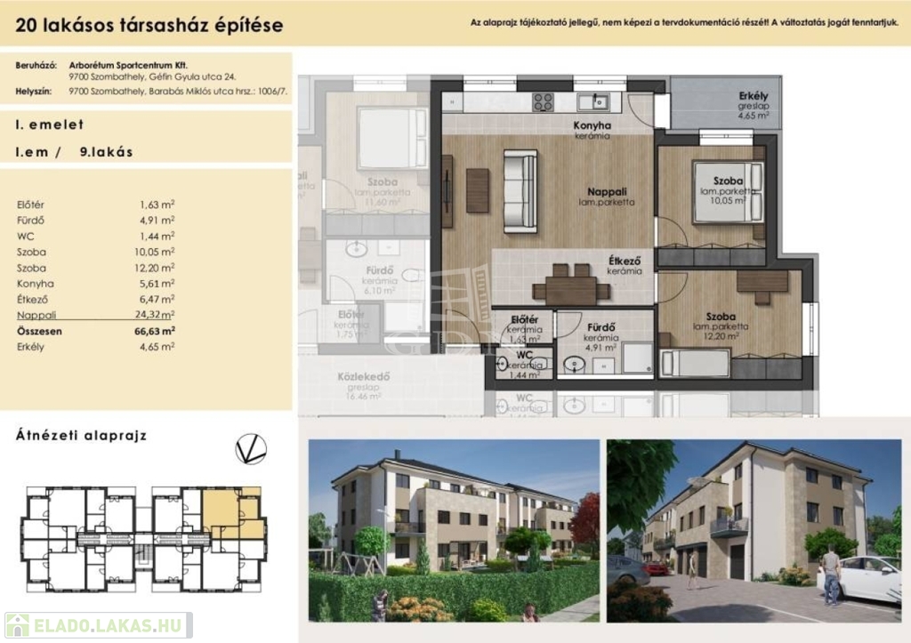 A három szintes kettő emeletes, 20 lakásos modern társasházak minden igényt kielégítő, magas műszaki tartalommal valósulnak meg. A kiváló tájolású 40-67 m2 közötti ingatlanokat nagyon jó elosztás és élhető terek jellemzik. A lakások nappali+egy , nappali +kettő szobásak lesznek. A földszinti lakások komfortérzetét teraszok, saját kertek az emeleti lakásokét jó méretű erkélyek fokozzák. Nyílászárói 3 rétegű fokozottan hő- és hangszigetelt üvegezésű műanyag ablakok és erkélyajtók, redőny fogadására alkalmas szemöldök kialakítással. A lakások bejárati ajtaja MABISZ minősítéssel rendelkező tömör, több ponton záródó biztonsági ajtó. Fűtése központi gázfűtés tervezett, kondenzációs gázkazánnal a lakásokban egyedi hőmennyiség szabályozással és mérővel, padlófűtéses hőleadással. Klímaelőkészítést a vételár magában foglalja. Hideg -meleg burkolatok ,szaniterek, csaptelepek, beltéri ajtók választhatók. Az ingatlanhoz felszíni parkoló, garázs vásárolható.