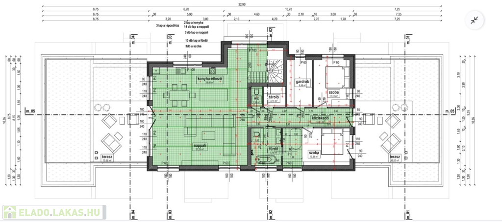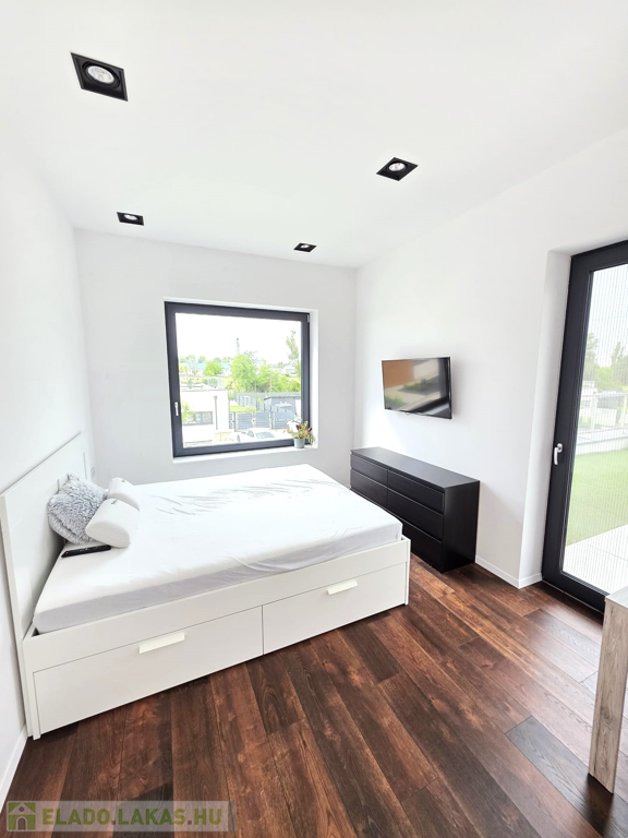 -2 hálószoba, 1 gardróbszoba, mosókonyha, tároló, külön fürdőszoba és mellékhelyiség, nappali, konyha, étkező egy légtérben.