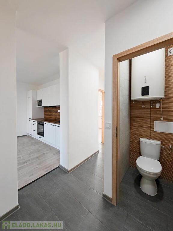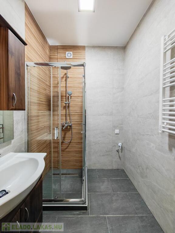 A fürdőszoba és a WC külön helyiségben található, mindkettő járólappal és csempével borított, modern megjelenést és praktikus elrendezést biztosítva.