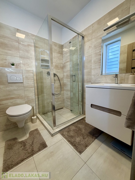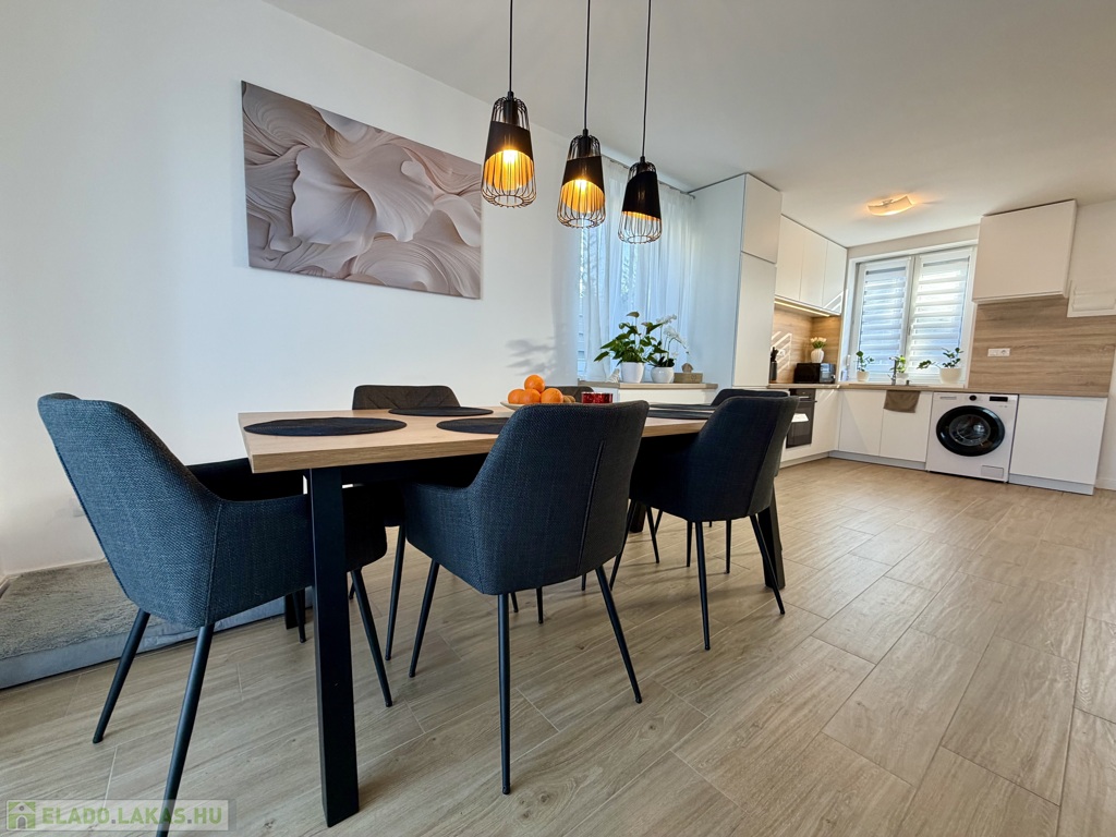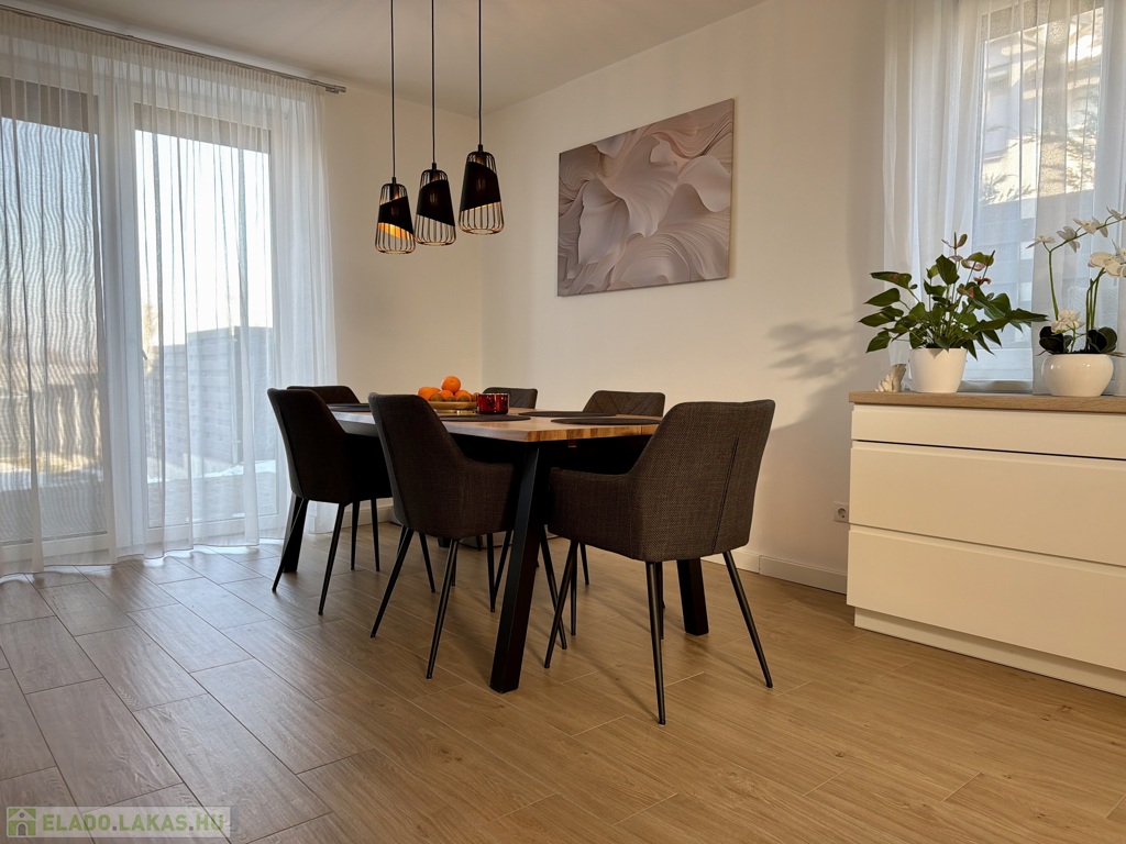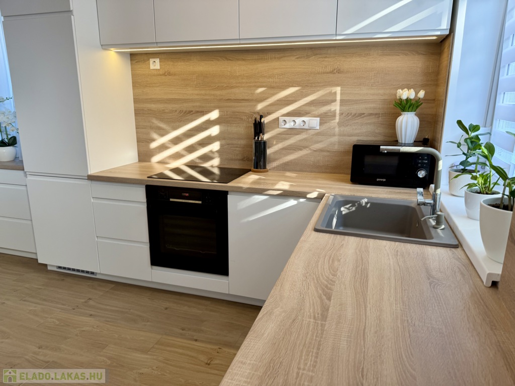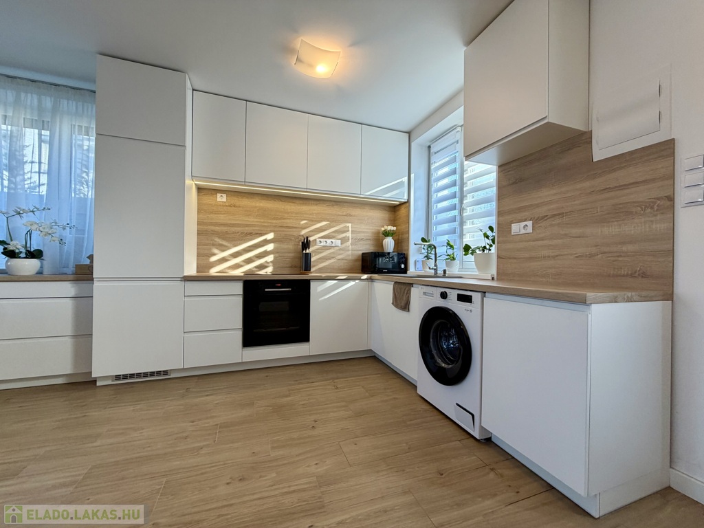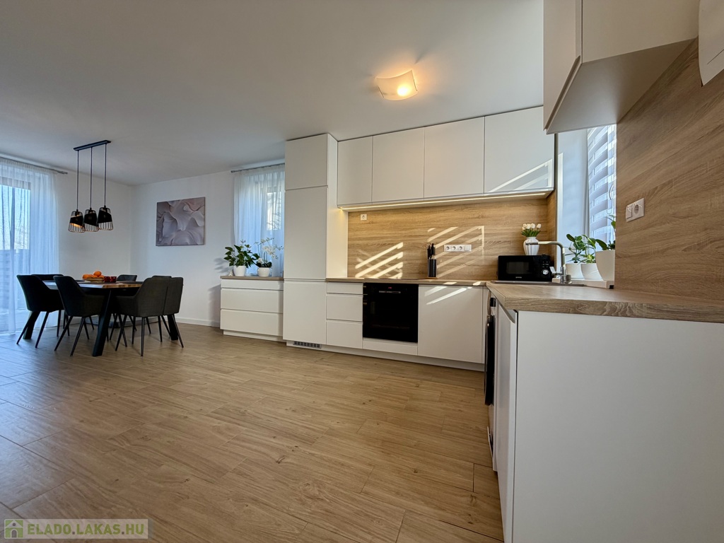A 77 m²-es lakótér átgondolt, családbarát elrendezésű. Három hálószoba biztosítja a privát tereket a szülőknek és a gyerekeknek, míg a két fürdőszoba a mindennapokat teszi gördülékennyé. A világos, modern élettérhez teljesen gépesített, beépített konyha kapcsolódik, így az ingatlan nem igényel további jelentős beruházást.