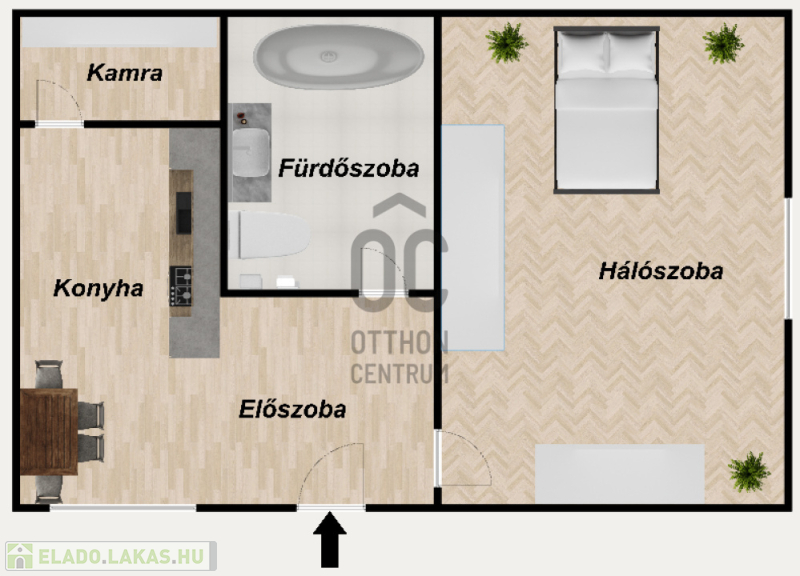 Elosztása: előszoba, tágas szoba, fürdőszoba WC-vel, konyha, kamra (spejz)