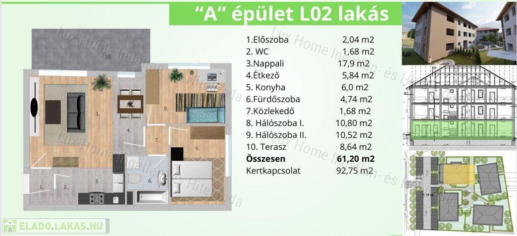 DL01: 51, 58 m2 + 180 m2 kert: 59.317.000 Ft