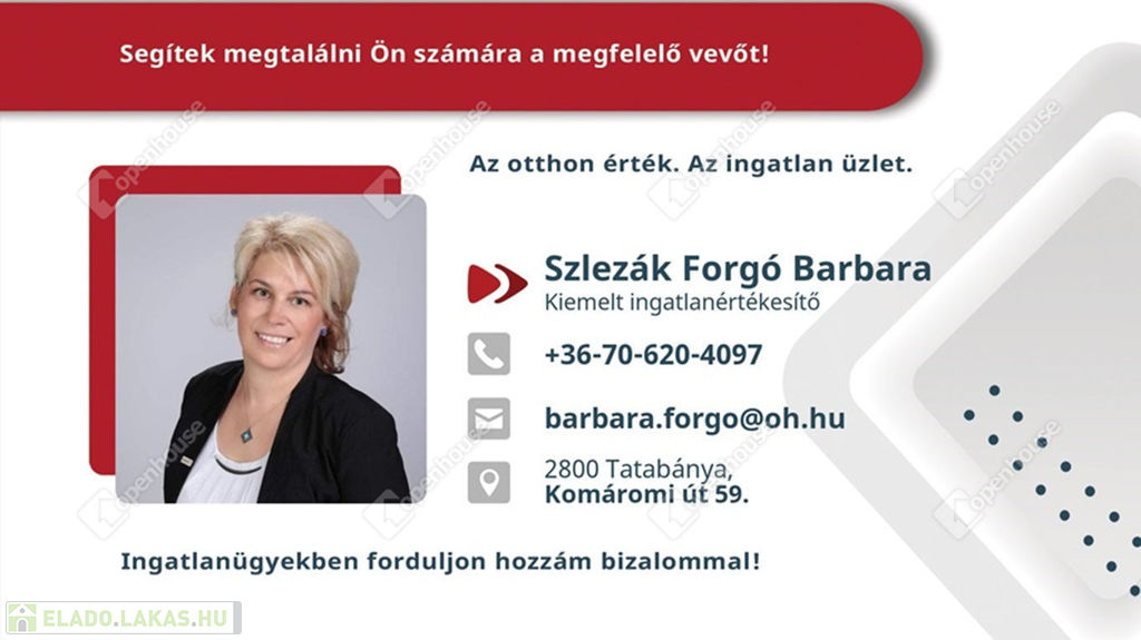 Ha felkeltette érdeklődését ez az eladó tatabányai nyaraló, vagy bármely más nyaraló és bővebb információt szeretne, keressen bizalommal.Hivatkozási szám: #171902Az Openhouse Tatabánya Ingatlaniroda tagjaként várom Önt az országos hálózatunk teljes kínálatával.A nyaraló vásárláshoz hitelt igényelne? Ingyenes hitelközvetítéssel segít Önnek bankfüggetlen hitelszakértőnk.További szolgáltatásainkkal (pl. értékbecslés, energetikai tanúsítvány, jogi háttér) is segítjük Önt a vásárlásban.Az otthon érték. Az ingatlan üzlet.