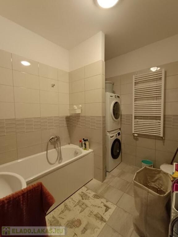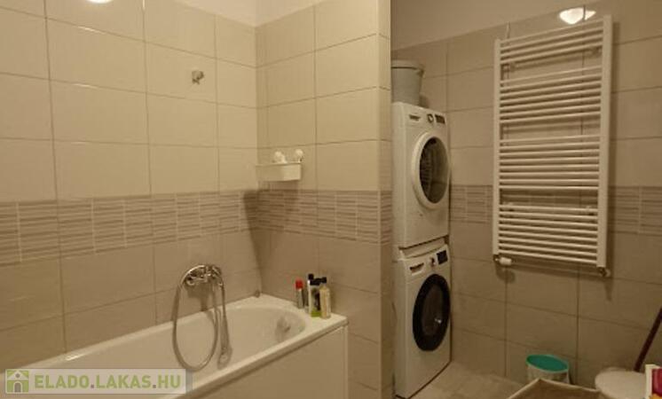 Fürdőszoba és WC: Minőségi és ízléses burkolatokkal ellátva, beépített zuhanykabinnal.