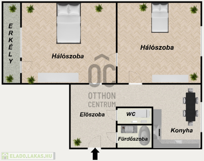 Praktikus alaprajza magában foglal előszobát, két külön nyíló szobát, konyhát, fürdőszobát és külön WC-t, így ideális választás lehet pároknak, kis családoknak vagy akár befektetőknek is.
