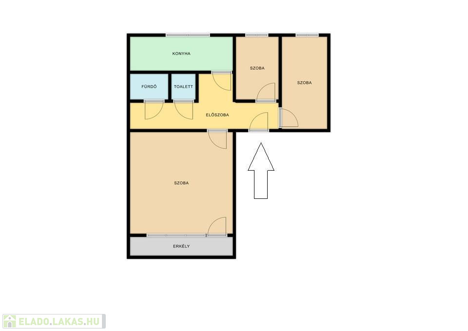 A nappali D-K-i fekvésű, napfényes, míg a többi helyiség É-Ny-i tájolású.