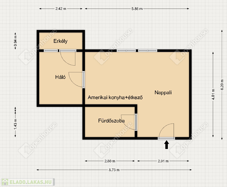 - 38 nm, 1+1 szoba, amerikai konyha nappalival