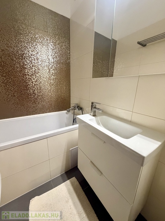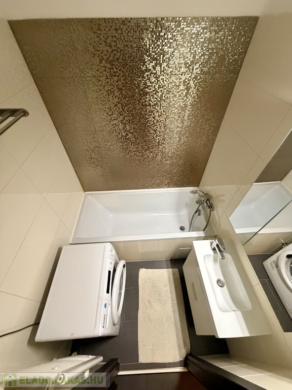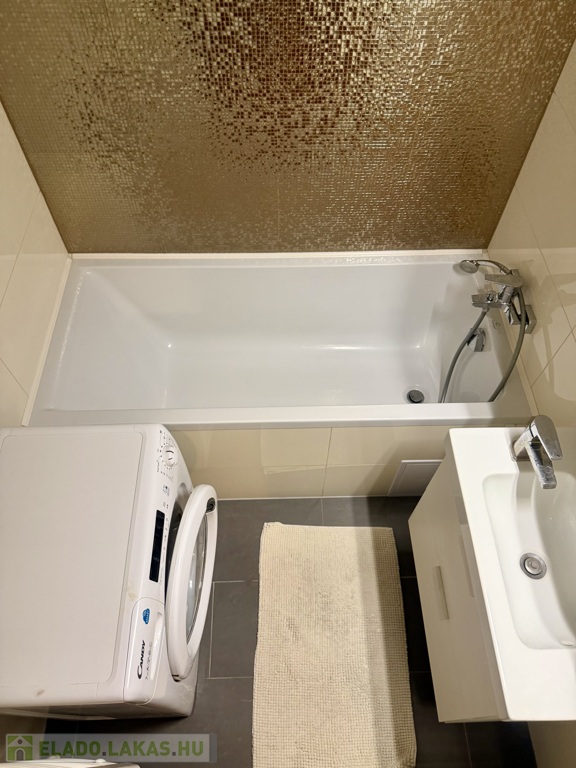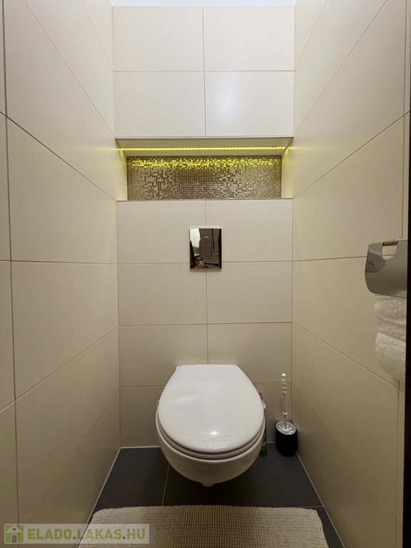 A fürdő és a WC külön helyiségben található, mindkettő modern burkolatokkal, Grohe-szerelvényekkel, a szellőzés elektromos vezérléssel lett megoldva.