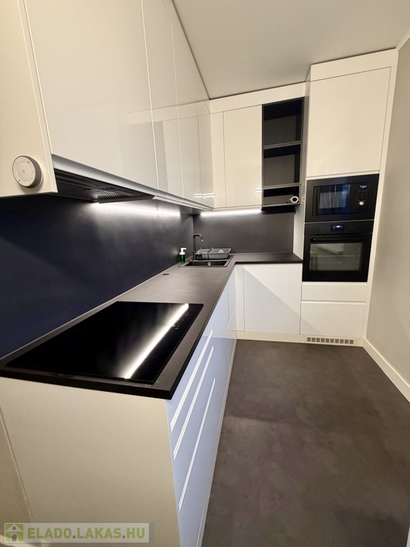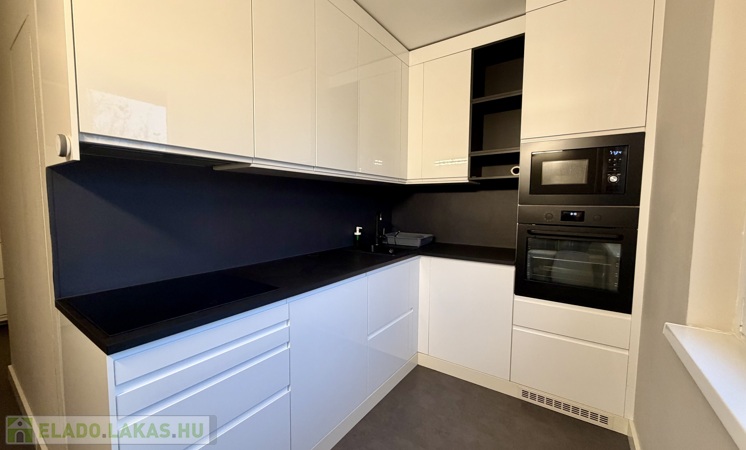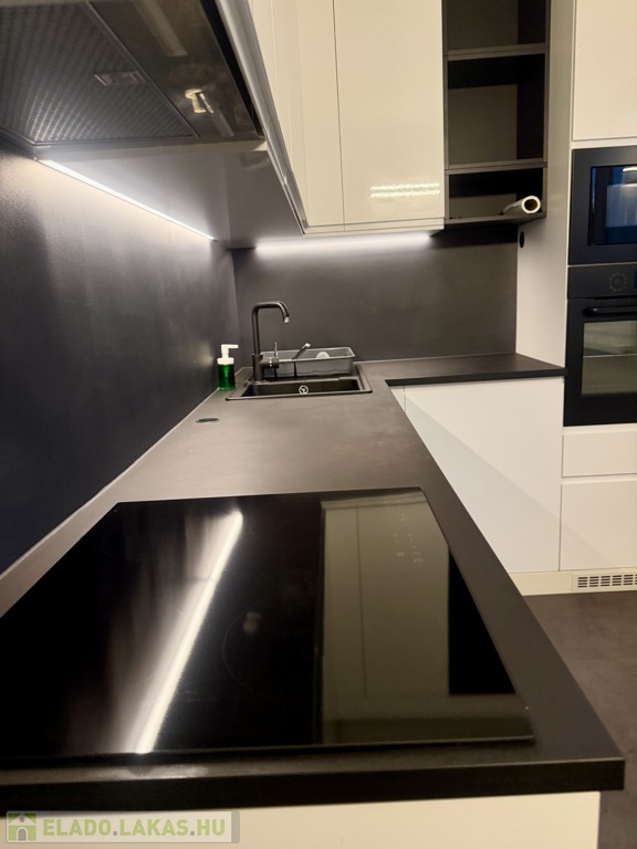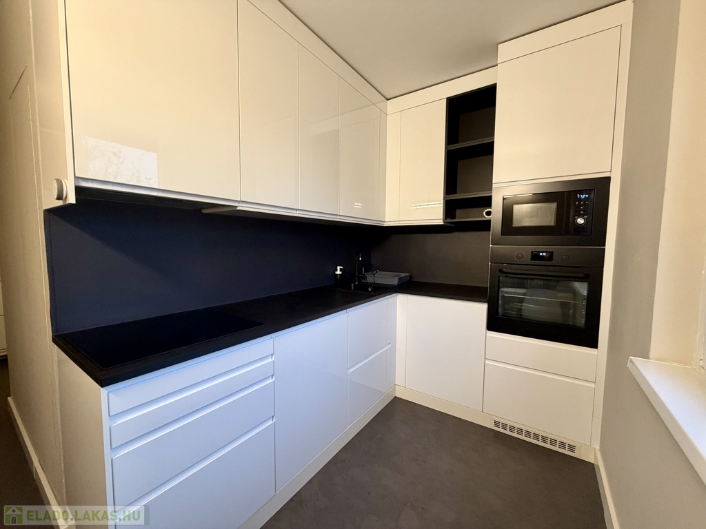 A konyha különösen figyelemreméltó: minőségi konyhabútor, praktikus elrendezéssel, beépített gépekkel (sütő, főzőlap, mikró, mosogatógép), amely így azonnal használatra kész.