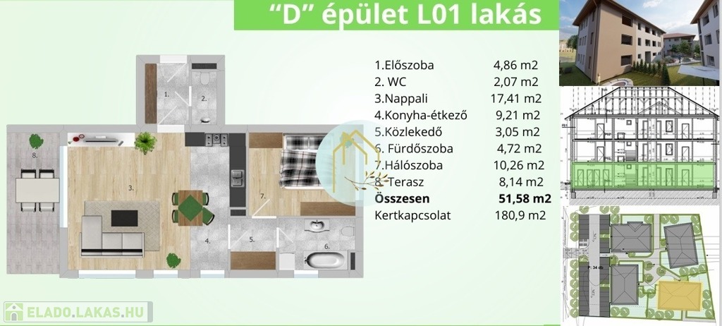 D épület 1-es számú lakása 180nm-es SAJÁT KERTTEL rendelkezik.