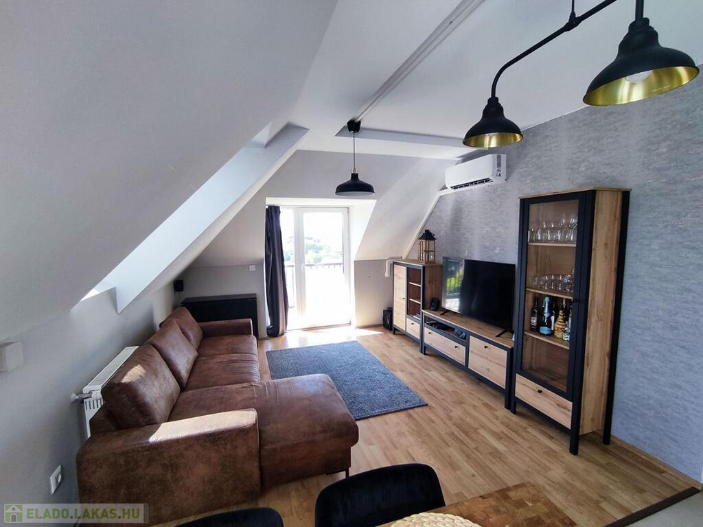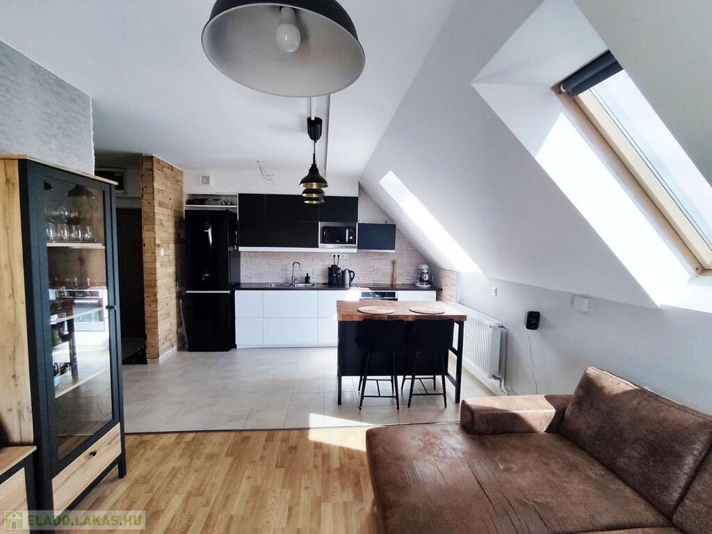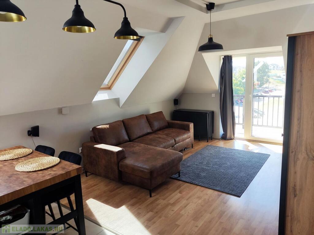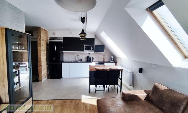 A lakás a harmadik emeleten található, három ízlésesen berendezett hálószoba, egy tágas amerikai konyhás-nappali és két nagyméretű fürdőszoba áll rendelkezésére a leendő tulajdonosnak a mindennapok eltöltéséhez. Az egyik fürdőszobában beépített kád, a másikban zuhanyzó, minőségi burkolatok és szaniterek találhatók. A szobákban laminált parketta, a konyhában és a fürdőben hidegburkolatok funkcionálnak padlóként. A két erkélyről páratlan panoráma nyílik a Gerecsére, ahol kipihenheti a hétköznapok fáradalmait. A magasfényű IKEA-s konyhabútor praktikus kialakításával, beépített gépekkel, indukciós sütővel és páraelszívóval élménnyé fogják tenni a konyhában töltött időt. A nyílászárókon redőny található, Velux árnyékolóval és szúnyoghálóval felszereltek. A tetőtér 20 cm-es gyapot, tükörfóliás szigetelést kapott, valamit egy hűtő-fűtő klíma is beszerelésre került, ami még kellemessebbé teszi a hőérzetet a téli és a nyári időszakban egyaránt.