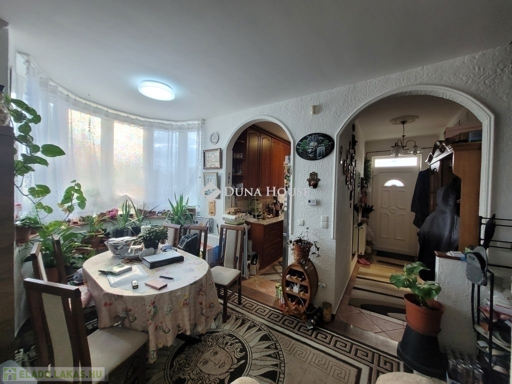 Sziklakertek és kerti tó szomszédságában szépen térkövezett udvaron, tuják között jutunk el a bejárati ajtóig. Az előszobába érkezve balra tágas, világos fürdőszoba található. Továbbhaladva jutunk a nappaliba, amelynek ékköve a jobb oldalon elhelyezkedő, félköríves beugró. Az ablakokon át beáradó természetes fény szinte körülöleli a teret, mely ideális étkezőként vagy olvasósarokként is szolgálhat.