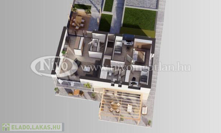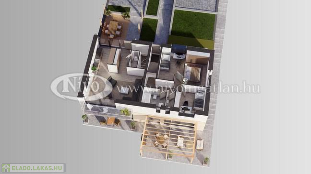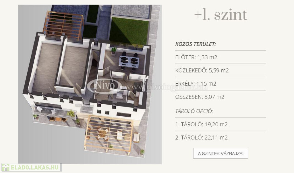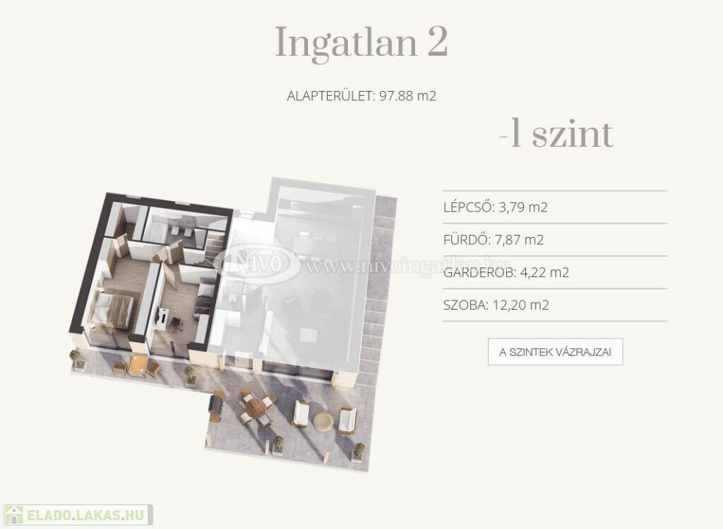 Az exkluzív kivitelezésű, három szinteltolásos társasházban (ikerház jellegű) 2 db belső kétszintes (egy 135,62 m2 és egy 97,88 m2) saját kertkapcsolatos lakás