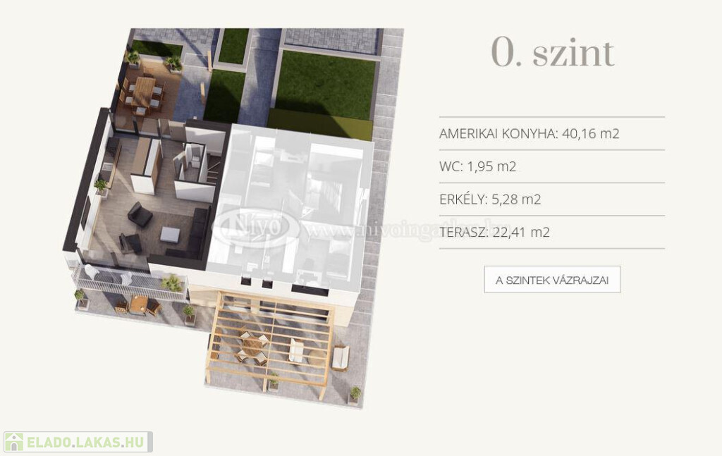 A hirdetésben szereplő lakás az egyes számmal megjelölt, amelynek alapterülete: 97,88 m2 plusz 22,41 m2-es terasszal és 5,28 m2 erkéllyel. Az ingatlanhoz kb. 340 m2 saját kertkapcsolat tartozik. Az árban egy 22,11 m2 tároló és az épület előtt gépjármű parkolására alkalmas felszíni parkoló is van. Kulcsrakész ár: 168 millió Ft.