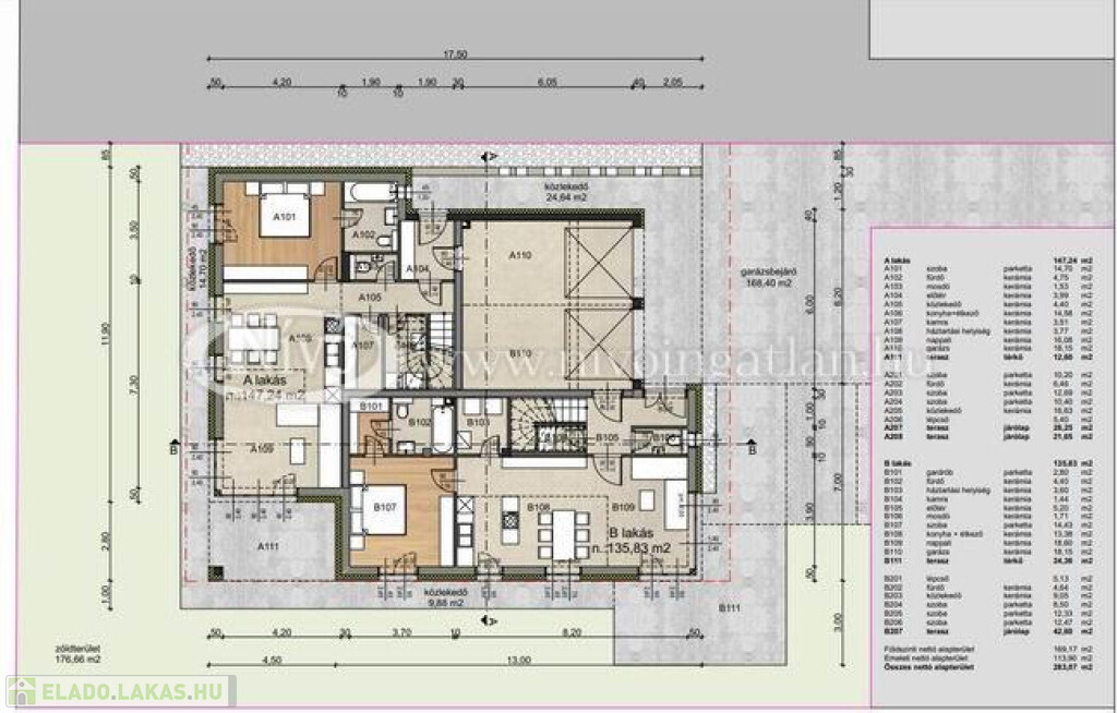 A két ikerházrész összesen 700 m2-es telken helyezkedik el, a B ikerházrészhez is használati megosztással saját használatú parkosított, 280 m2 kertrész tartozik. A telek területe 280 m2 összesen, mely úgy oszlik meg, hogy 90 m2 privát terület, 190 m2 pedig osztatlan közös tulajdonrész.