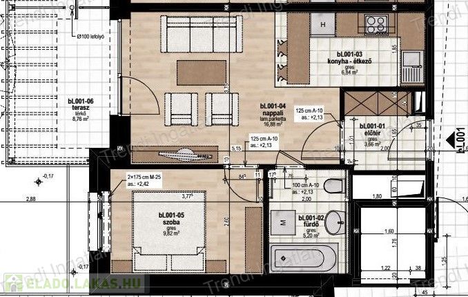A meghirdetett földszinten található 42,40 nm-es lakásban amerikai konyhás nappali, szoba, fürdőszoba, előtér található. A nappaliból 8,76 nm-es terasz és 21,45 nm-es kertkapcsolat nyílik.